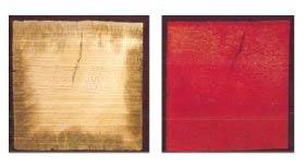 Respecto a los biocidas convencionales (a la izquierda un tablón impregnado solo unos centímetros con arseniato). Las sales de boro pueden ser absorbidas hasta el centro de un tablón de 25 cm (a la derecha). La absorción de las sales de boro queda evidenciada por un indicador químico que se vuelve rojizo con su presencia. Test realizado con autoclave 1 ½ hora a 12 atm. Sobre un tablón de conífera de 25 cm.
