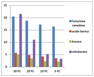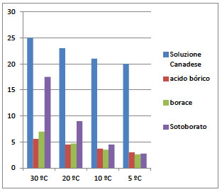 Gráfico 2. Solubilidad de varios compuestos de boro en agua relacionados con la concentración de la Soluzione Canadese. (azul).
