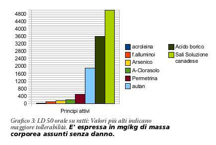 Podemos observar como las sales de boro (ácido bórico) y todavía más aquellas contenidas en la Soluzione canadese, tienen una alta tolerancia, incluso si los comparamos con biocidas considerados como más tolerables como la Permentrina y el Autan (el anti-mosquitos que esparcimos en verano sobre nuestra piel). En particular las sales presentes en la “Soluzione canadese” reúnen una tolerancia de 5000mg/kg, equivalente a 400 gr cada 80 kg de masa corporal.